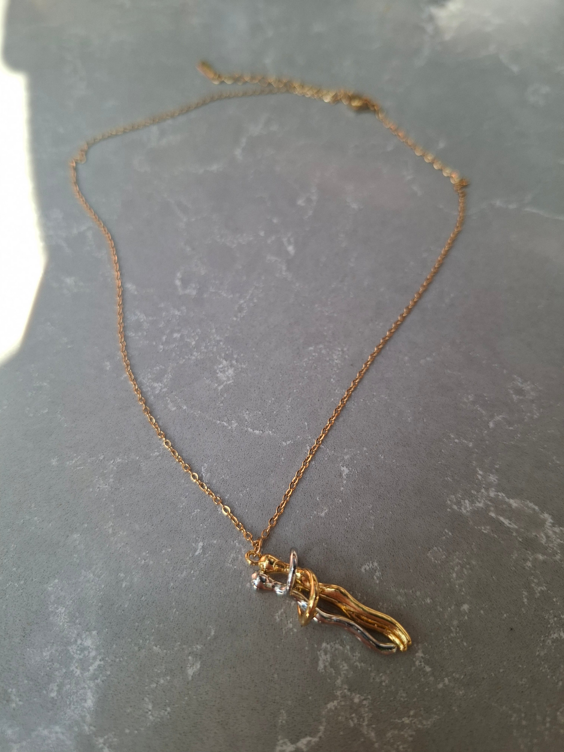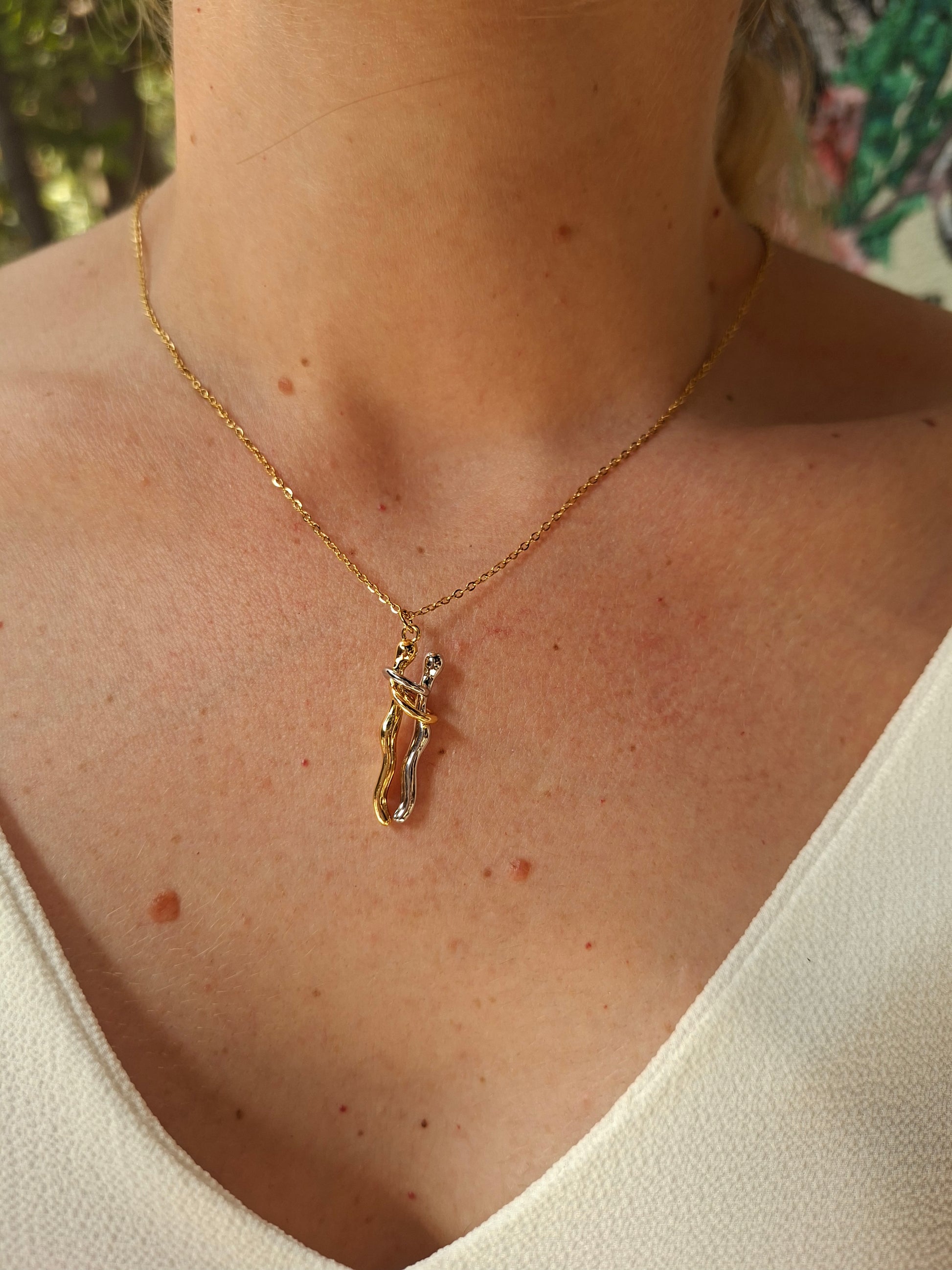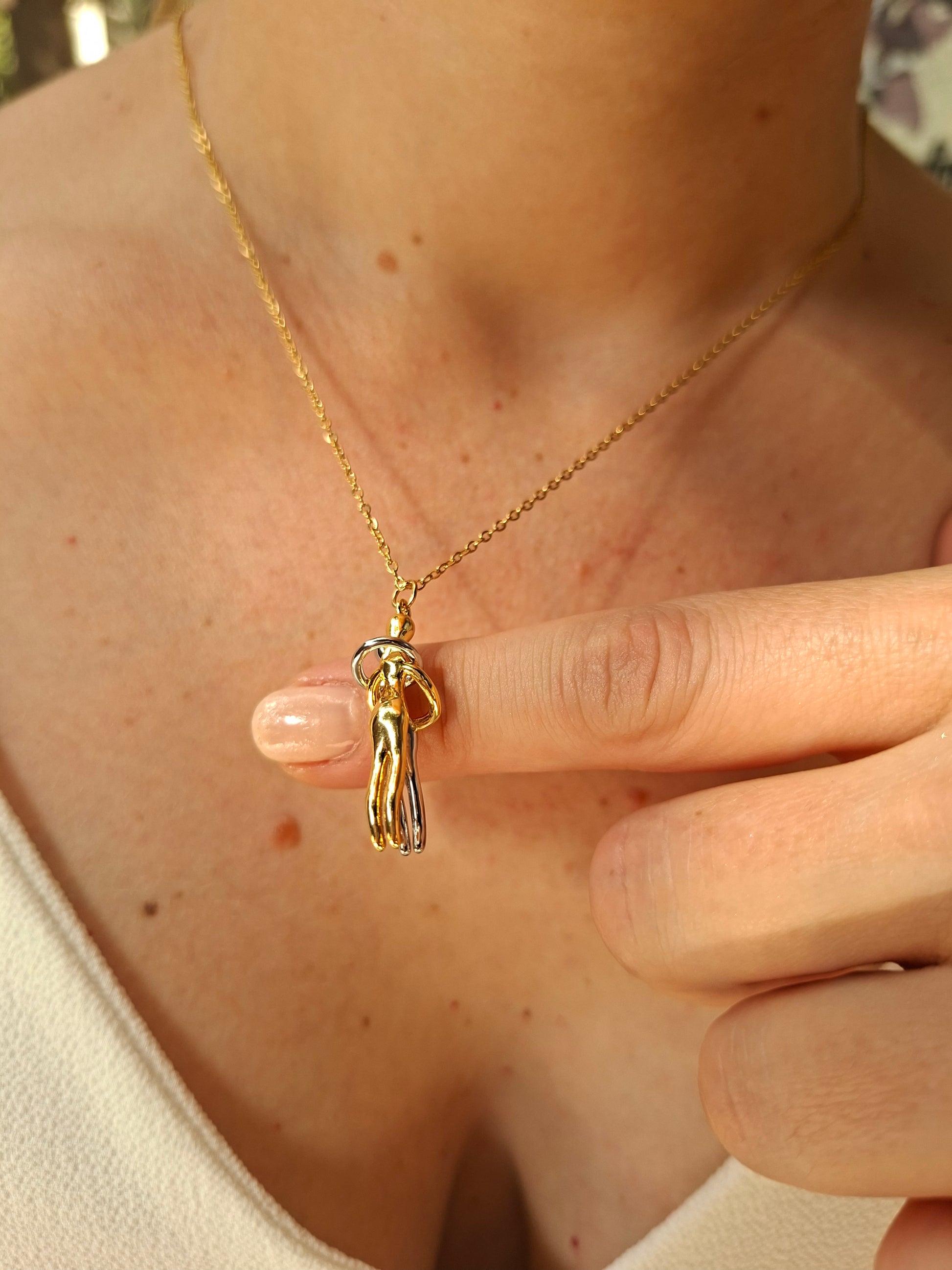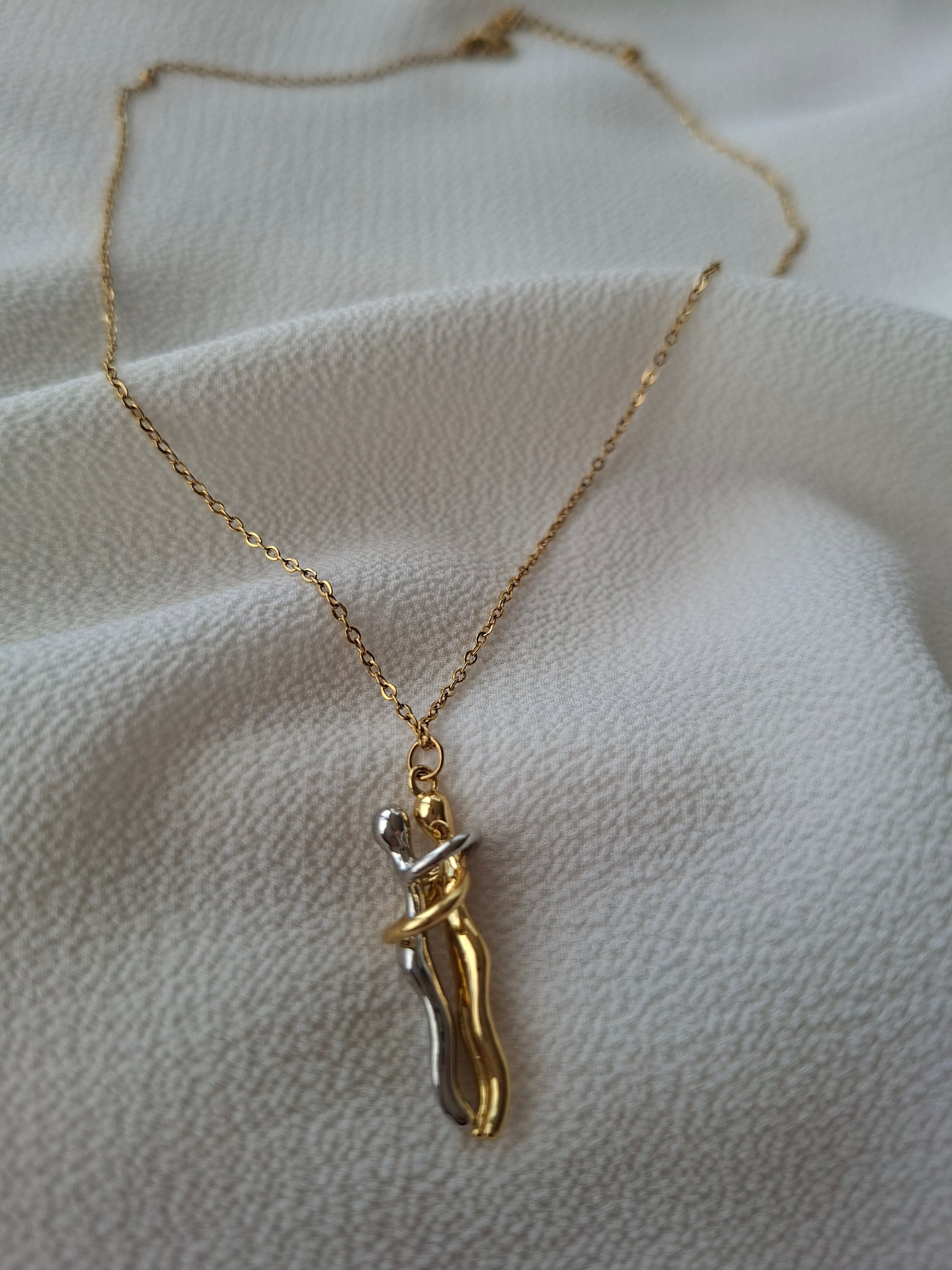 Birbirine sımsıkı sarılan iki figürden oluşan bu özel kolye, aşkı, bağlılığı ve sadakati en saf haliyle sembolize ediyor. Her baktığınızda, sevdiklerinizle paylaştığınız o güçlü bağı, güveni ve sevgiyi hatırlatıyor. Bu kolye, yalnızca şık bir takı değil; içinde derin bir anlam barındıran, ömür boyu hatıra olarak kalacak değerli bir parça.
